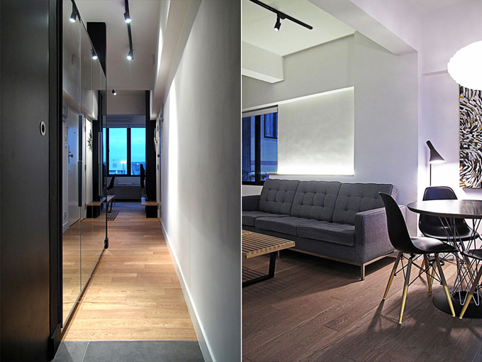 Студия дизайна OneByNine воплотила в жизнь интересный проект Invader Apartment (Захватчик квартиры) Гонконг. Квартира уютная, не пентхаус, одна спальна, комната для отдыха и санузел. Ничего лишнего как для Китайских жителей. В оформление интерьера были использованы Алюминиевые композитные панели, а также дерево, стекло, керамика.
